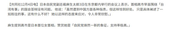 12月3日晚,麻生在东京的议员聚会上直言不讳,说高市的表态“一点问题都没有”,还得意地说“很高兴她打破了以往的模糊立场”。