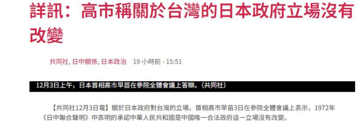 就是这句话,被一些日本媒体刻意加工,把竹内真二质询里的“台湾是中国领土”这句话,直接嫁接到高市的回答里,营造出一种“高市认怂”的假象。